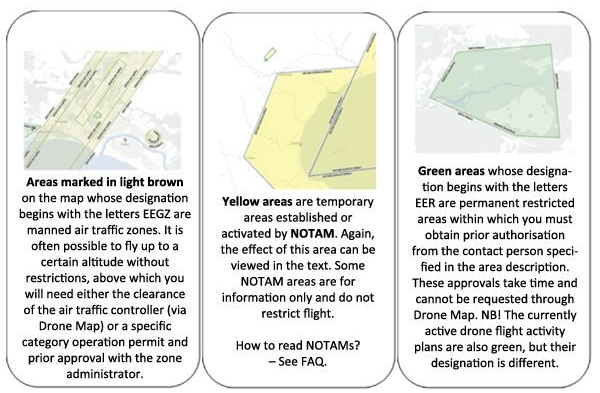 More information on the different geographical areas can be found here: https://transpordiamet.ee/en/aviation-and-aviation-safety/flying-drones-estonia/geographical-zones: https://transpordiamet.ee/lennundus-ja-lennuohutus/droonidmehitamata-ohusoidukid/geograafilised-alad